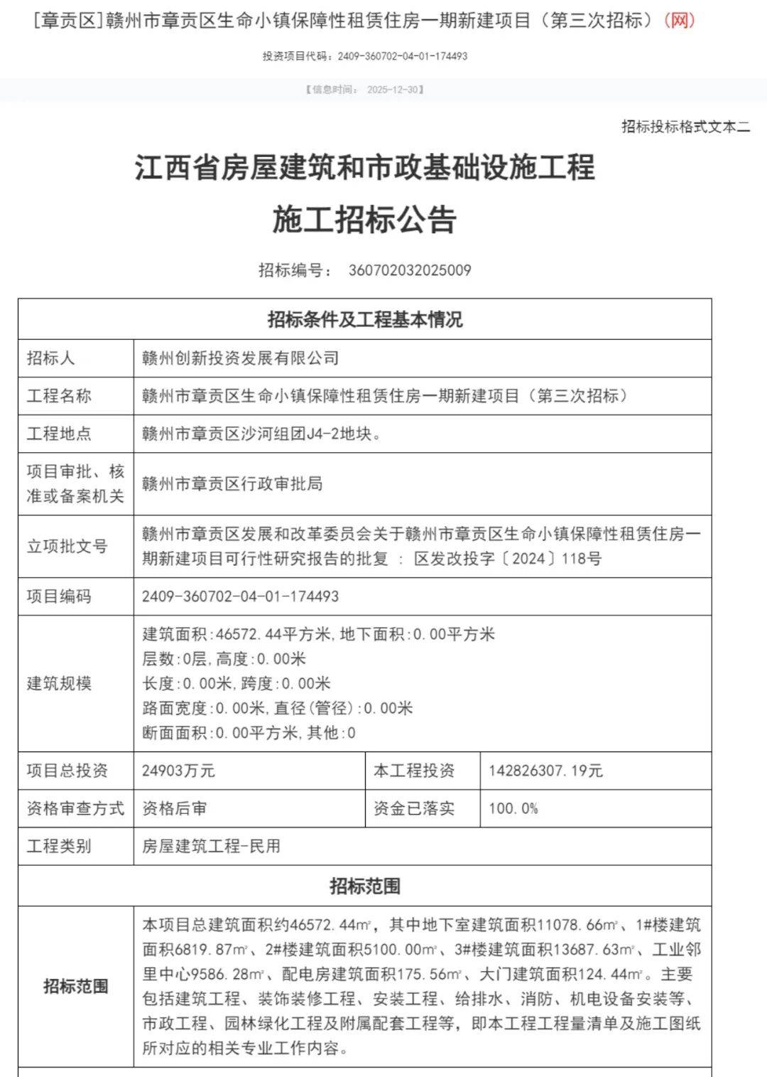 投标范畴:本项目总建建面积约46572.44㎡,近日,平台发布了赣州市章贡区生命小镇保障性租赁住房一期新建项目(第三次投标)投标通知布告,投标报酬赣州立异投资成长无限公司,周边工业及财产园较多,临近章贡高新区第一小学、喷鼻山院、返迁房等。位于赣州市章贡区沙河组团J4-2地块,次要包罗建建工程、粉饰拆修工程、安拆工程、给排水、消防、机电设备安拆等、市政工程、园林绿化工程及从属配套工程等,即本工程工程量清单及施工图纸所对应的相关专业工做内容。